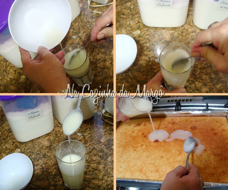 Depois de assado e ainda quente, furar o bolo com garfo e fazer este glacê para despejar: