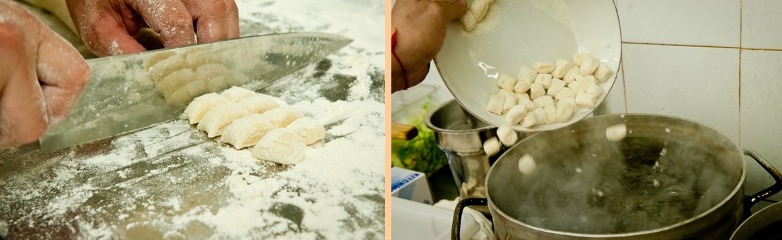 Faça rolinhos em mesa enfarinhada e corte gominhos de 2 cm. com uma faca também enfarinhada. Deixe secar um pouco numa bandeja forrada com pano enfarinhado. Para cozinhar o nhoque tem truque: fique de olho na água fervendo. Os que começarem a boiar, você já pode caçar com a espumadeira e colocar na travessa em que vai servir.Coloque sempre aos poucos. À medida que subirem à tona, retire-os com uma escumadeira e mergulhe rapidamente em água fria. Faça isso com todos os nhoques. Arrume em um refratário: uma camada de nhoques, uma de molho de tomate e polvilhe com queijo ralado. Repita as camadas. Leve ao forno ligeiramente, apenas para gratinar. Enfeite com manjericão.