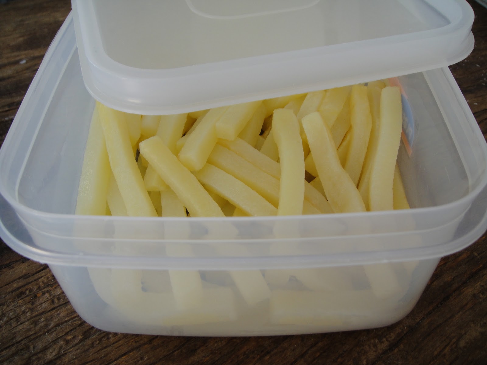 Descasque e mantenha-as dentro d'água para evitar que elas escureçam. Corte as batatas em formato palito, como na foto. Ferva uns 2 litros d'água, acrescente um punhado de sal, o vinagre branco e cozinhe as batatas durante 10 minutos. Escorra e enxugue-as. Numa frigideira grande, esquente cerca de 1 copo de óleo e frite as batatas por 50 segundos, mexendo de vez em quando. Escorra as batatas em papel toalha e congele-as em um pote hermeticamente fechado durante no mínimo 24hs e máximo de 2 meses.
