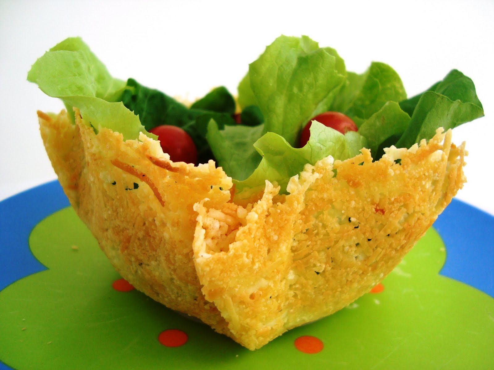 Quando tiver soltado da panela, vire e deixe corar um pouquinho também.Vire a casquinha de queijo dentro de uma saladeira, apertando por dentro para fazer a forma ou sobre o fundo de um copo, de cabeça para baixo.