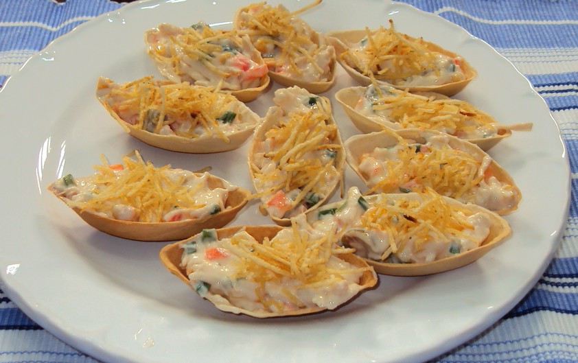 Misture todos os ingredientes em uma vasilha, menos a batata palha. Leve à geladeira por pelo menos 30 minutos. Retire da geladeira, misture 1/2 pacote da batata e encha as barquetes. Use a outra metade da batata palha para decorar.