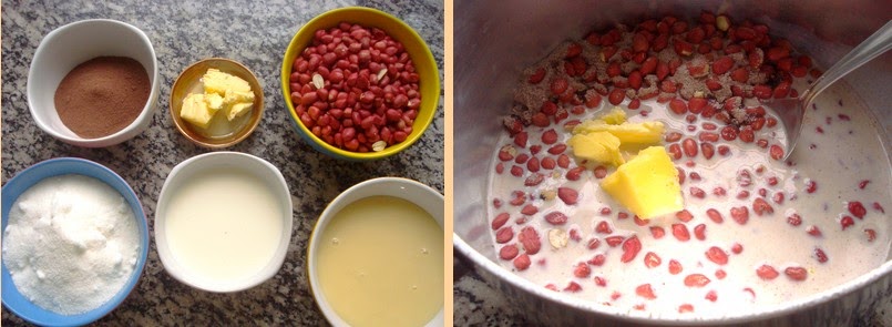 Coloque em uma panela o amendoim com o açúcar, deixando queimar o açúcar por igual até derreter totalmente. Jogue o leite condensado, a margarina e o chocolate, mexa até aparecer o fundo da panela.